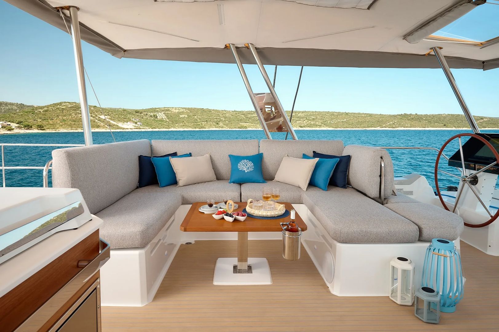Outdoors, the generous space continues with a beautiful teak deck spanning most of the exterior. The front area offers popular trampolines, a lowered sitting lounge, and a relaxing jacuzzi for best Croatian cruising experience. The flybridge is an ideal spot for sipping cocktails while taking in the views. Both the cockpit and flybridge provide ample room for dining and lounging.